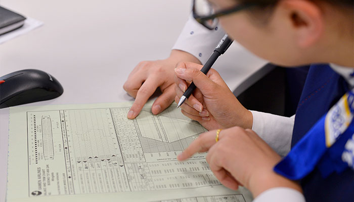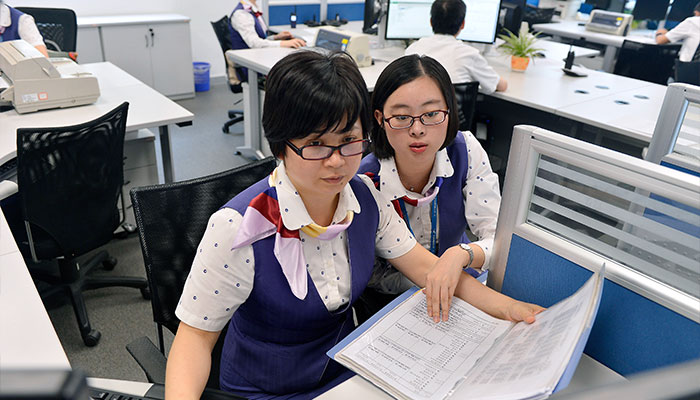 4、带班长平均有20年工作资历,肩负协调处理厦航本外站航班运行涉及载重平衡的工作。图为配载带班长根据复兴航配载工作要求,复核配载员舱单制作情况。贺晟 摄