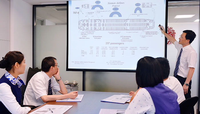 3、不同机型性能特性不同,载重平衡工作会有不同的差异性。图为配载教员为配载员和河北航新员讲解B787机型座位布局,以及该布局情况下的重心位置,明确舱位安排注意事项。贺晟 摄