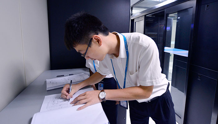 2、厦航的中心机房是高度敏感的区域,管理上必须保证绝对的安全。图为系统维护师正在仔细填写进出机房登记表,时间、人员、事由必须填写完整,确保安全责任到人。贺晟 摄