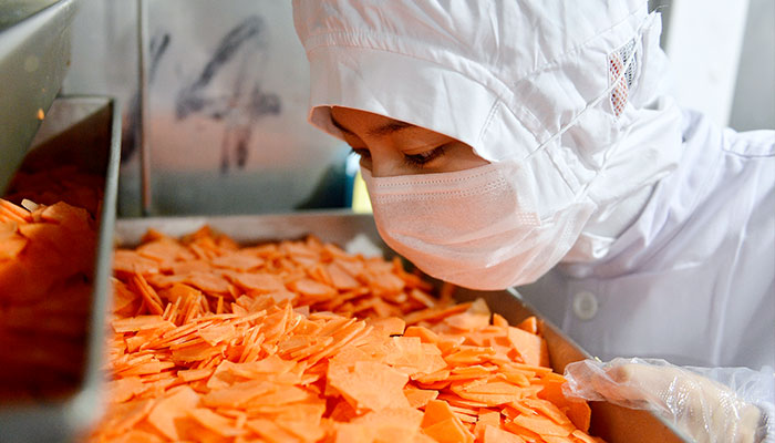 1、在餐食进行烹煮前,质检员需要对原材料品质进行再次检查,确保原材料的安全、卫生以及新鲜度等,前移风险管理关口。图为质检员在对下锅前的生胡萝卜片品质进行感官检查。贺晟 摄