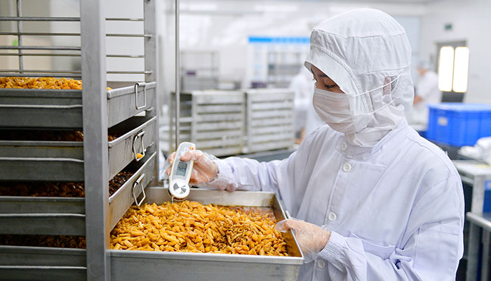 2、温度是影响餐食品质变化的重要因素,因此,对于温度的监控贯穿于原材料验收、烹调、速冷、摆盘等重要环节,并将其列为关键控制环节进行重点监控。图为质检员在使用探针测温仪对餐食进行温度监测。贺晟 摄