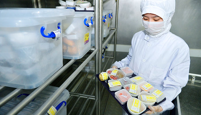 3、每天,质检员需对当日生产配送的每批次热食、甜品、冷食等航空餐食成品进行留样。所留样品需盛放于清洗消毒后的专用容器内,用保鲜膜封好,做好标识,放于专用的样品箱内。贺晟 摄