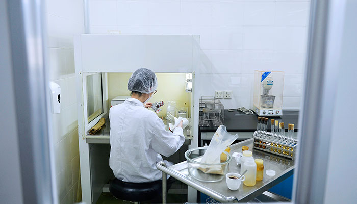 4、实验室检测也是质检工作中不可或缺的环节。质检员每日对餐食进行微生物检测,结合部分理化检测,以及食用油酸价检测、煎炸油极性组分检测等,从而确保餐食品质。图为质检员在处理实验样品。贺晟 摄
